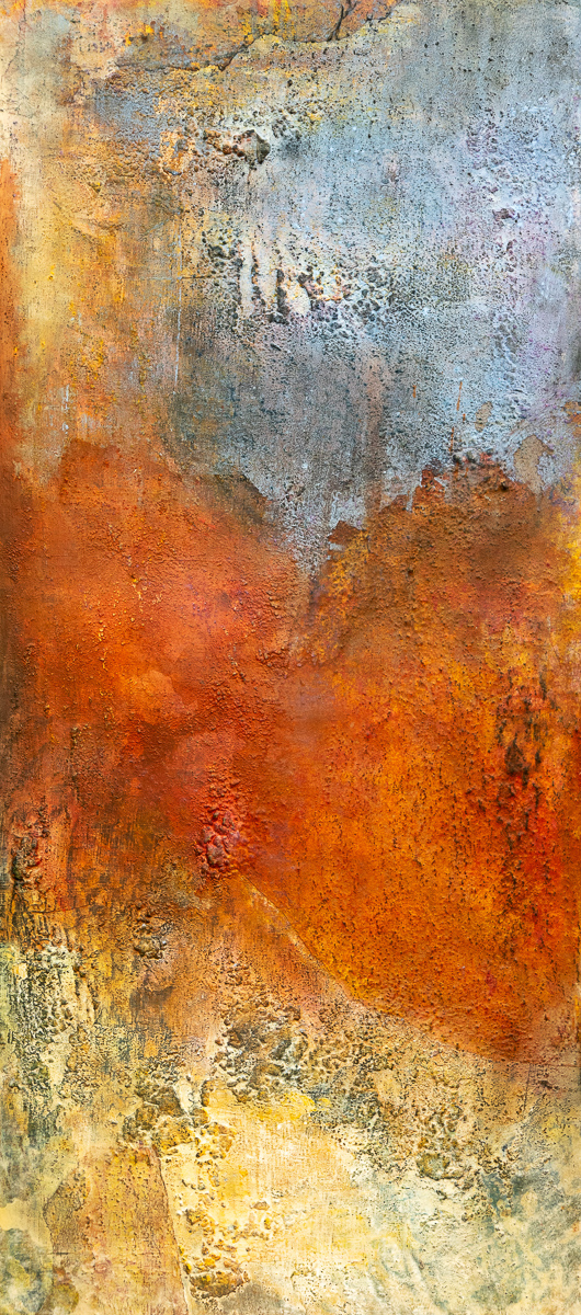 Im Dialog mit der Leuchtkraft reiner Pigmente entstehen Werke von vibrierender Farbkraft, die in Kombination mit feinen Collagen aus Chinapapier zum genaueren Hinsehen einladen. Immer wieder arbeitet sie auch mit Wachs, das ihren Bildern eine samtige, fast reliefartige Präsenz verleiht.